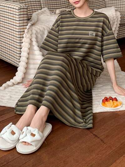 Striped Mini Letter Print Decorated Casual Dress, Moo Moo Lounge Dress Pajama-39%