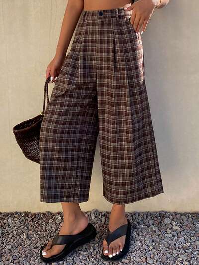 Contrast Color Plaid Loose Capri Pants, Casual Women Trousers For Spring & Autumn