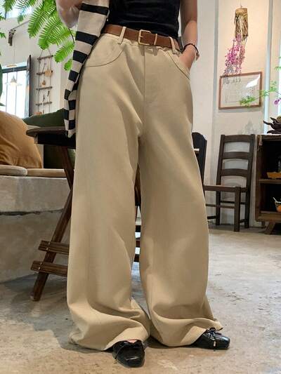 Solid Color Loose Pocket Wide Leg Pants With Elastic Waist And Drawstring For Women-47%