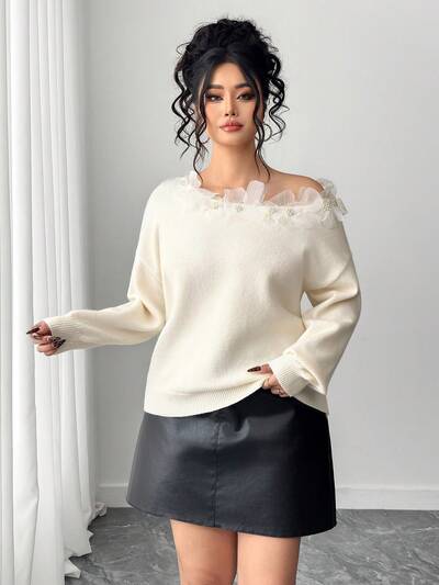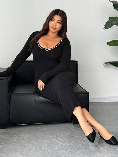 Dazy Plus Plus Size Women Rhinestone Embellished V-Neck Bodycon Long Sleeve Maxi Sweater Dress, Suitable For Banquet, Autumn/Winter Prom Dress