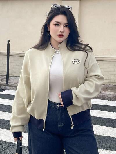 Dazy Plus Color Block Zip-Up Cardigan Sweater With Embroidery Pattern, Casual Plus Size Women, Autumn/Winter