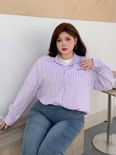 Dazy Plus Plus Size Letter Embroidered Regular Striped Collared Long Sleeve Shirt,Fall Clothes-65%