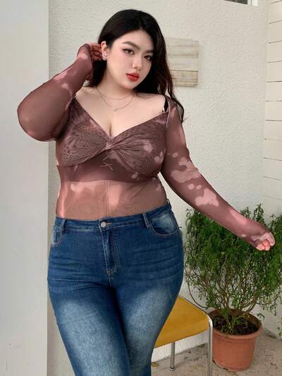 Dazy Plus Plus Size Printed Slim Fit Mesh Top With Sweetheart Neckline And Twist Knot Detail Long Sleeve Women Tops Going Out Tops Women-60%