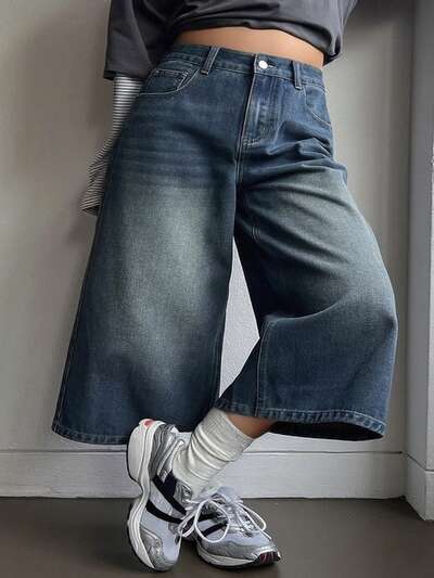 Plus Size Washed-Out Loose Baggy Wide Leg Cropped Denim Jeans, All Season Jorts-40%
