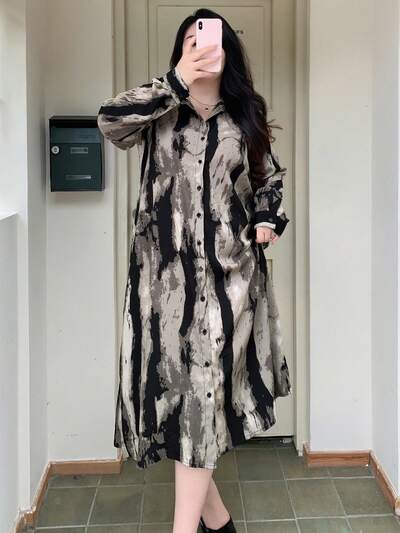 Dazy Plus Plus Size Turndown Collar Ink-Dyed Loose Long Sleeve Maxi Shirtdress,Fall Dress-37%