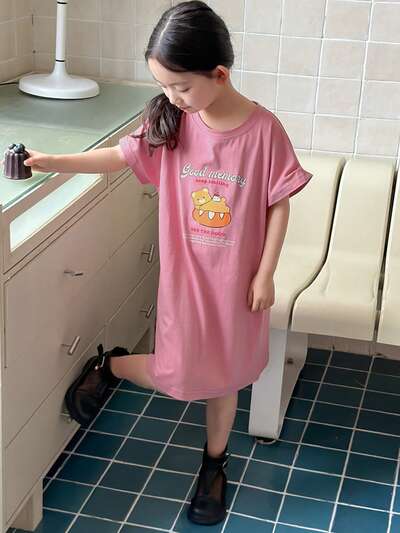 Young Girls Round Neck Knit Printed Short Sleeve Dress, Fall Clothes-68%