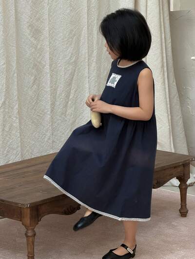 Young Girl Summer Casual Solid Color Ruffle Trim Round Neck Sleeveless Dress-66%