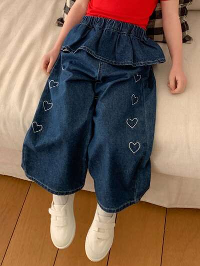 Young Girls Heart Decor Ruffled Trim Denim Jeans, Fall-46%