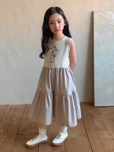 Young Girls Round Neck Summer Casual Street Print Short Sleeve Mid-Length Dress-48%