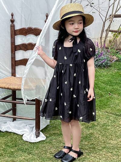 Floral Print Square Neck Short Puff Sleeve Dress For Young Girls-64%