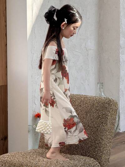 Young Girls Floral Print Knit Camisole Off Shoulder Dress, Young Girl Fall Clothes Spring-48%
