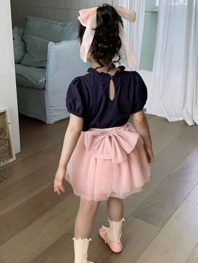 2pcs/Set Young Girl Round Neck Puff Sleeve Solid Color Casual T-Shirt & Mesh Butterfly Decor Skirt Set, Girls Summer Outfits-47%