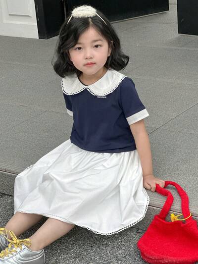 Young Girl Summer Casual Peter Pan Collar Short Sleeve T-Shirt And Pleated Skirt Set-60%