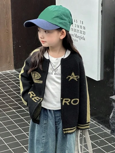 Young Girls Round Neck English Contrast Stripe Casual Long Sleeve Cardigan Fall,Winter-42%