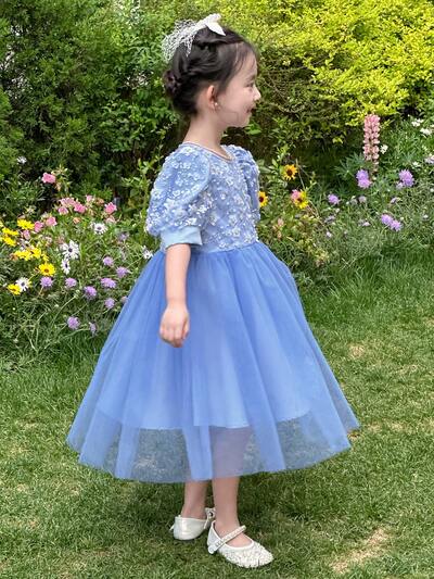 Young Girl Round Neck Mesh Patchwork Elegant Short Sleeve Summer Dress Formal Outfit-44%