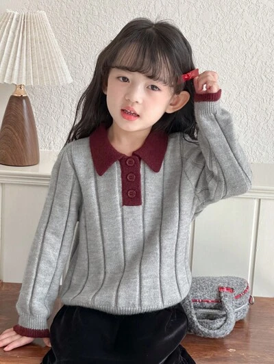 Young Girl' Contrast Color Polo Collar Korean Style Long Sleeve Sweater, Spring/Autumn-46%