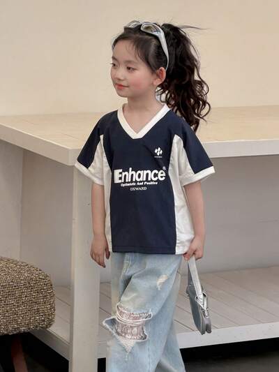 Young Girls V-Neck Contrast Color Short Sleeve Casual Street Shirt-74%