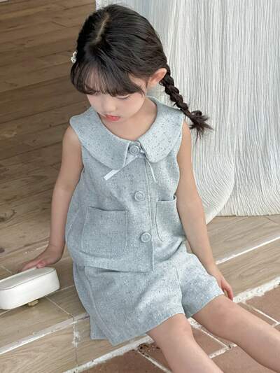 2pcs Sleeveless Bow Decor Blouse And Shorts Set For Young Girls-46%