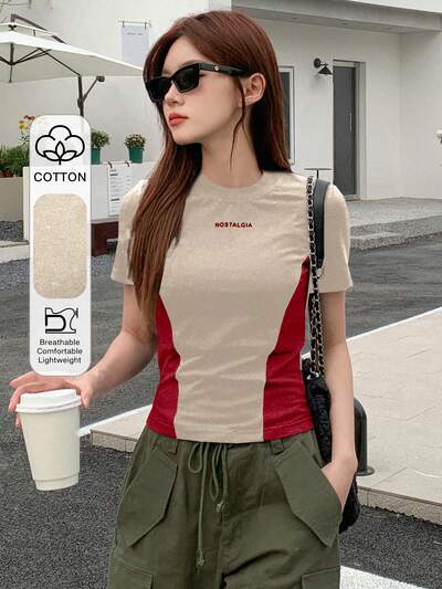 Women's Summer Casual T-Shirt With Round Neckline, Letter Print And Color Block Design Preppy Tops-43%