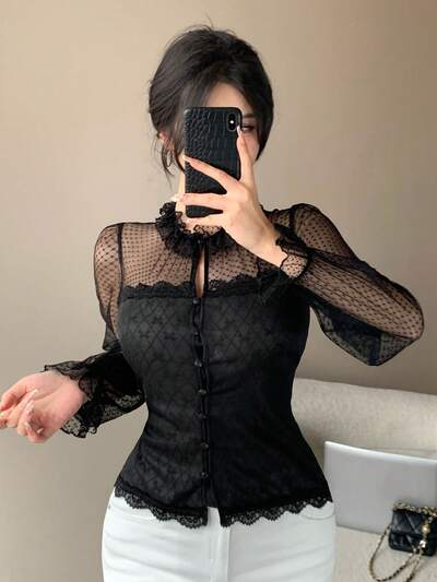 Women's Black Polka Dot Sheer Mesh Patchwork Lace Blouse, Elegant For Valentine's Day, Wedding, Party, Formal Occasion, Slim Fit Thin Mesh Long Sleeve Top, Suitable For Summer, Autumn, Spring