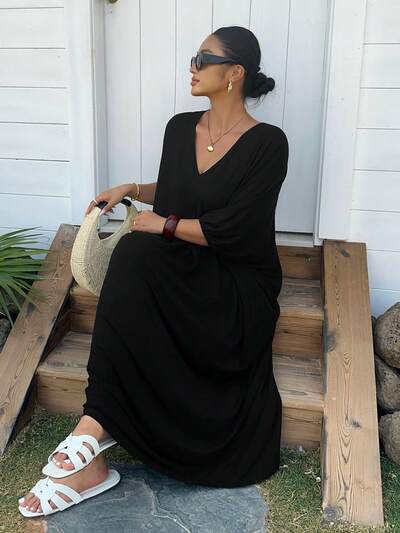 Dazy Plus V-Neck Solid Color Batwing Sleeve Long Plus Size Women Nightgown, Spring/Summer-34%