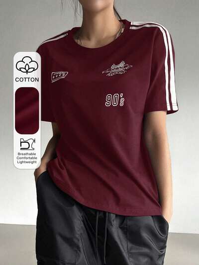 Women Summer Short Sleeve Casual T-Shirt With Motorcycle Style Letter Print And Striped Decoration Jersey,Fall Clothes