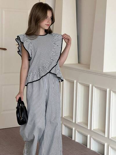 Tween Mädchen-Set mit gestreiftem Rüschentop und geraden Hosen-46%
