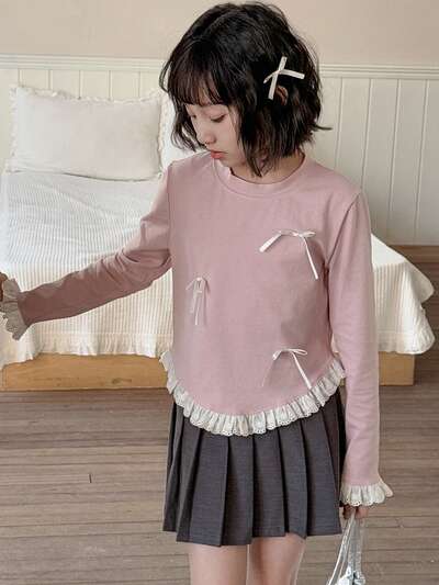 Tween Mädchen Rundhals Spitze Patchwork Strick Kurzarm T-Shirt, Herbstkleidung, Kleidung für den Schulanfang-57%