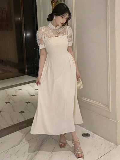 Damen weißes Kleid mit Spaghettiträgern, sommerliches, einfarbiges, im neuen chinesischen Stil verbessertes Cheongsam-Eleganz-Plissee-2-Teile-Set