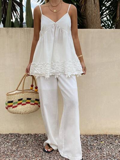 2 Stücke/Set Damen Lässig Spitze Patchwork Trägerhemd und Hose-26%
