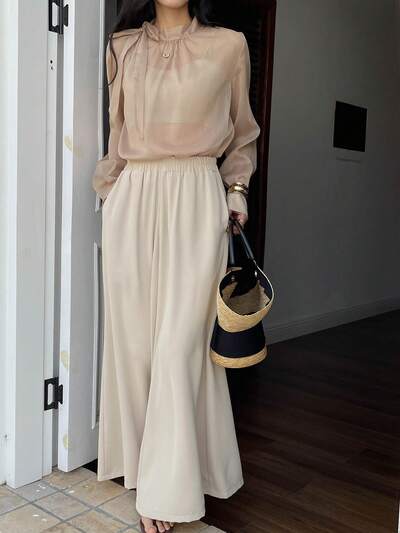 Damen elegantes Pendler-Outfit aus einfarbiger Bluse und weiter Hose, 2-teiliges Set für den Sommer-27%