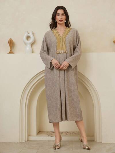 1 Stück Damen V-Ausschnitt Kurzarm Taille Asymmetrisches Midi-Kleid aus Leinen