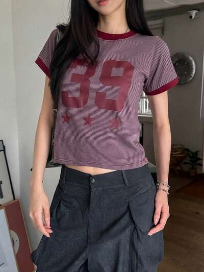 Retro amerikanischer Farbblock Buchstaben-Muster Kurzarm T-Shirt, Slim Fit vielseitiges Lässig Top für Frauen Grafik-Shirts Frauen Crop Tops Frauen