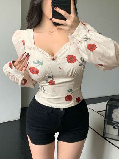 Blumen Muster Langarm Form Passende Damen Bluse, Lässig & Urlaubsstil, Sommer-73%