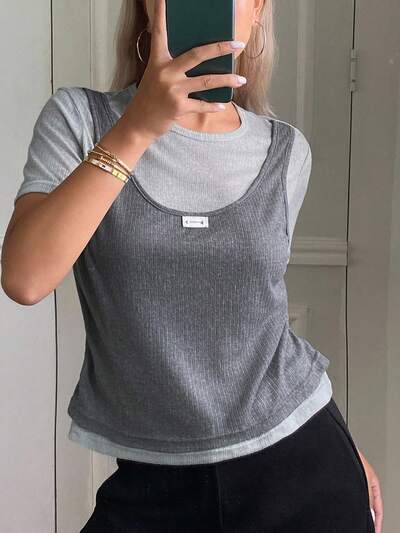 Damen Patchwork-Ärmellos-Top, Lässig Street Style T-Shirt, Herbst-69%