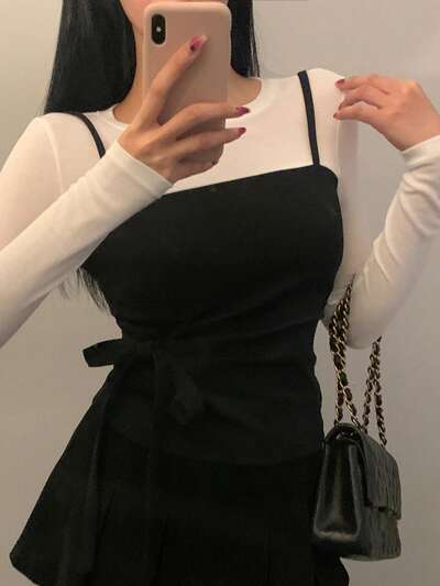Damen Set aus französischer Spitzebesatz koreanischem Stil Trägerhemd und langärmeliger Knopfleiste Bluse-60%