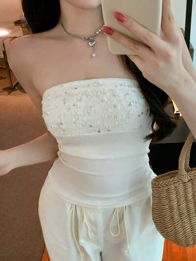 Pailletten-Patchwork taillierter Bandeau-Lässig-Sommertop für Frauen-67%