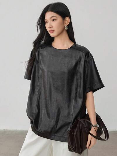 Lässiges & formelles, locker geschnittenes, minimalistisches PU Kurzarm Rundhals Damen T-Shirt, Business Casual für Lehrerinnen-60%