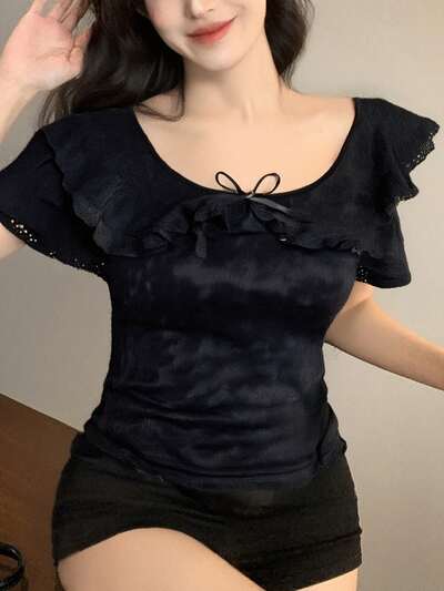 Sommer Neuankömmling Schleife Dekor Damen T-Shirt mit Passform, modisch, Rüschen-60%