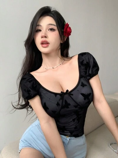 Damen Schmetterling Mesh durchsichtiges Kurzarm Top mit großem Rundhalsausschnitt, Crop Tops für Frauen, Ausgeh-Tops für Frauen-60%