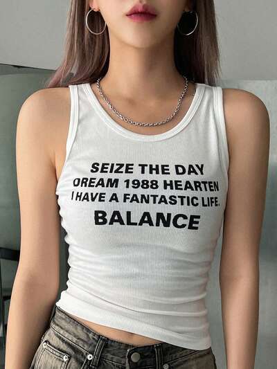 Trägertop mit Slogan Grafik und Raffung an der Seite - "ERGREIFE DEN TAG TRÄUME 1988 ERFREUE ICH HABE EIN FANTASTISCHES LEBEN IM GLEICHGEWICHT Festival"