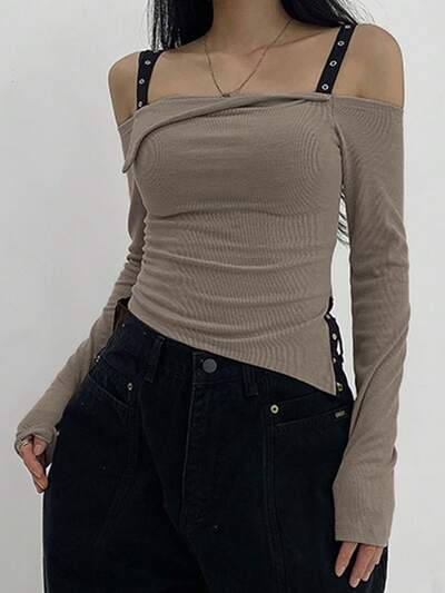 Damen Asymmetrische Schulter Langarm Taillierte Bluse, Herbstkleidung-60%