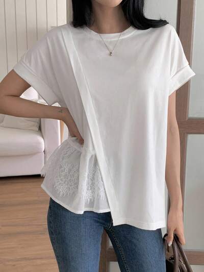 Damen Sommer Rundhals Taille Spitze Patchwork Lässig Pullover Kurzarm T-Shirt-55%