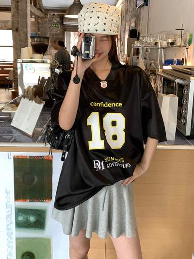 Damen Lässig Koreanischer Stil T-Shirt mit Buchstaben- und Zahlen-Muster, Frühling/Sommer-36%