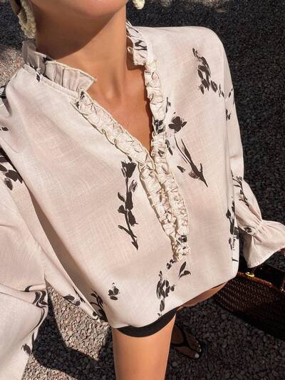 Blume Muster, locker geschnittene Bluse mit Rüschen-Saum und Langarm, eleganter Urlaubslook für Frauen, Frühling/Herbst-36%