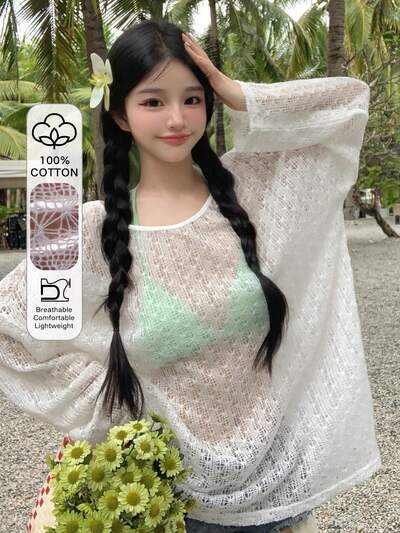 Damen Loose Fledermaus Ärmel Transparente Langarm Rundhals Lässig T-Shirt