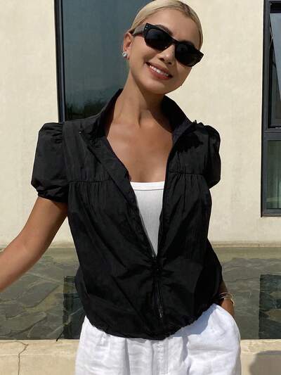 Damen Einfarbiges, tailliertes Kurzarmshirt mit hohem Kragen, Reißverschluss und Raffung, lässig für Urlaub und Sommer