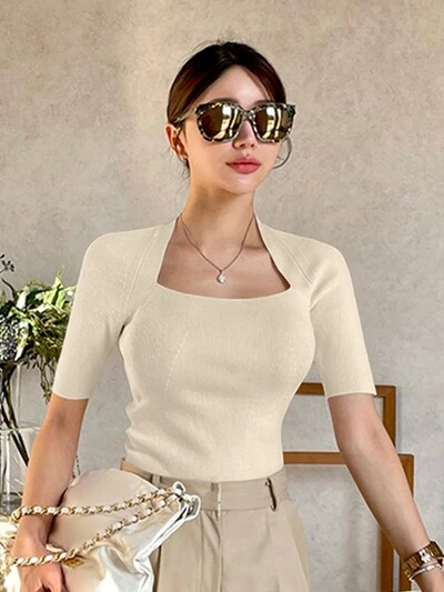 Damen anliegendes, deformiertes Strickoberteil mit quadratischem Ausschnitt für den Sommer, Kleidung für den Schulanfang