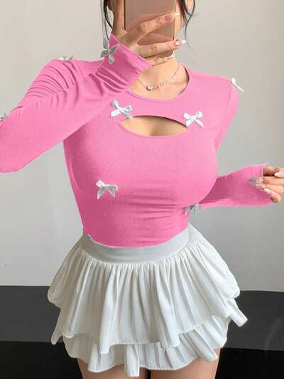 Damen Lässig V-Ausschnitt T-Shirt mit Spitzen- & Schleifen-Dekor, Farbkontrast Design, figurbetont, geeignet für Damen Langarm Tops im Herbst, Damen Kleidung für den Herbst