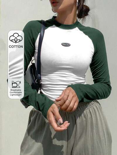 Damen Lässig Langarm T-Shirt mit Kontrast-Schulter und Applikations-Buchstaben-26%